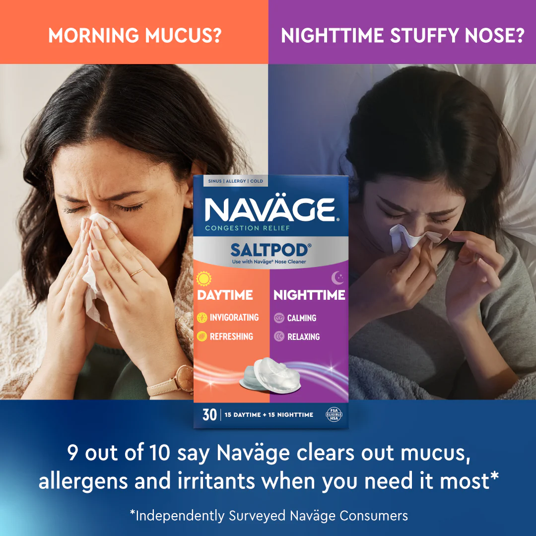 Support your breathing around the clock with the Naväge Daytime & Nighttime SaltPods. Enjoy a refreshing, drug-free cleanse to kickstart your mornings and a soothing experience for restful nights.